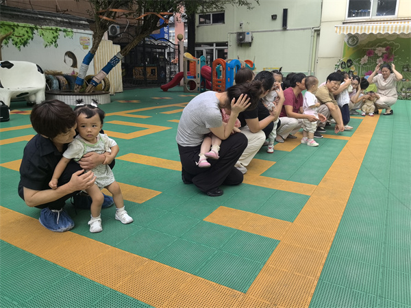 當(dāng)急促的警報聲在早教中心上空響起,防空疏散演練正式開始,各班教師立即引導(dǎo)幼兒雙手護(hù)頭,蹲在桌子底下。第二聲警報響起,各班教師組織幼兒和家長彎下腰、抱住頭,快速、有序地按照路線疏散至指定位置,演練活動沒有擁擠踩踏事故發(fā)生。師幼撤離至安全區(qū)域后,班級教師查看幼兒情況并安撫幼兒情緒等工作,確保每位小朋友安全撤離,無一人遺漏,警報解除之后,老師們立即清點、核對幼兒人數(shù)并向安幼教育集團(tuán)早教指導(dǎo)中心副園長陳敏報告。
