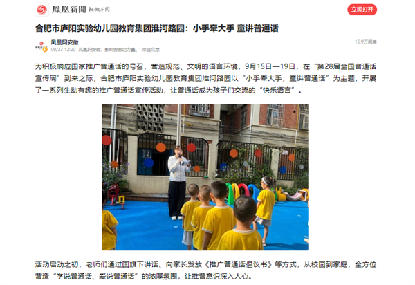 廬陽實驗幼兒園教育集團(tuán)淮河路園:《鳳凰網(wǎng)》報道《合肥市廬陽實驗幼兒園教育集團(tuán)淮河路園:小手牽大手 童講普通話》
