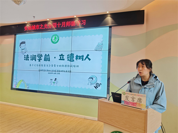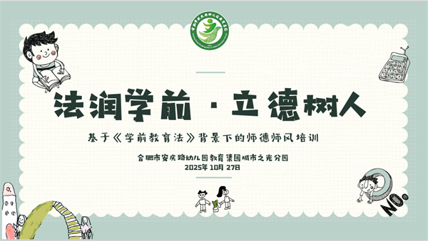 為進一步加強幼兒園師德師風建設,2025年10月27日,合肥市安慶路幼兒園教育集團城市之光分園組織開展了以“法潤學前,立德樹人”為主題的全體教職工師德師風專題培訓。本次培訓旨在引導教師深刻理解法律法規(guī)對學前教育的要求,爭做新時代“有法度、有溫度”的幼教人。
