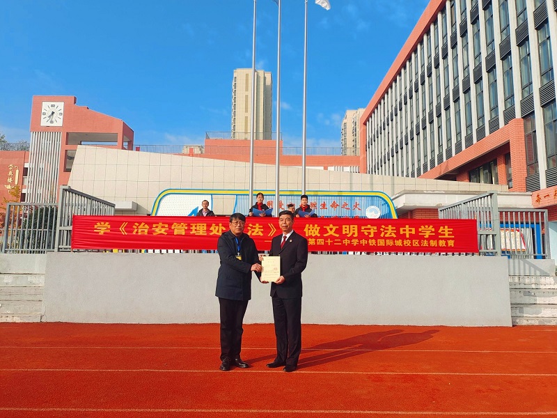 升旗儀式后,學校黨支部書記、校長武江義為學校法治副校長廬陽區(qū)人民檢察院副檢察長張卓頒發(fā)聘書。