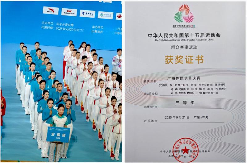 9月21日,由國(guó)家體育總局主辦的第十五屆全國(guó)運(yùn)動(dòng)會(huì)群眾展演廣播體操項(xiàng)目決賽在珠海圓滿落幕。安徽省代表隊(duì)由省司法系統(tǒng)民警、高校教師及廬陽教師共同組成。代表隊(duì)?wèi){借規(guī)范整齊的動(dòng)作、高度協(xié)同的團(tuán)隊(duì)配合,以“動(dòng)作如行云流水,隊(duì)形似刀切斧劈”的出色表現(xiàn)征服賽場(chǎng),從眾多參賽隊(duì)伍中脫穎而出,最終榮獲全國(guó)三等獎(jiǎng),贏得現(xiàn)場(chǎng)熱烈掌聲。